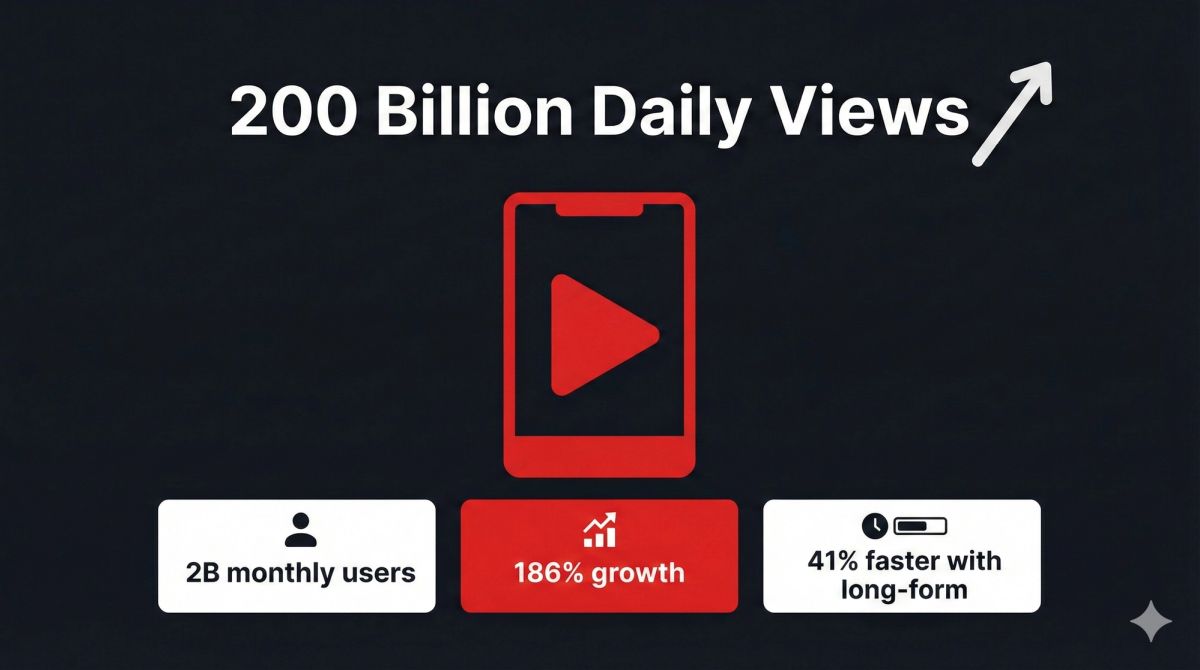 In his January 2026 annual letter, YouTube CEO Neal Mohan confirmed that YouTube Shorts now averages 200 billion daily views. That is up from 70 billion daily views reported in March 2024, a 186% increase in under two years. To put the scale in context: 200 billion daily views is equivalent to every person on earth watching roughly 24 Shorts per day.